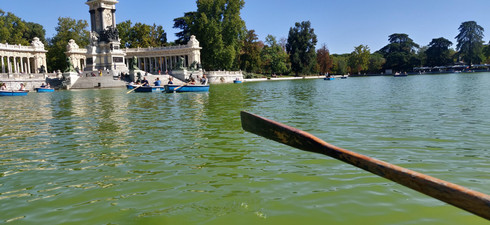 In Retiro, we got to visit the central "lake", called the Estanque Grande del Retiro, and also visited the museums that serve as special exhibitions for the Reina Sofía. One of them was the Palacio de Cristal, or Glass Palace. I had already visited this on one of my prior visits. At that time, we had seen the exhibit but right now, they were between exhibits. The other museum was the Palacio de Velázquez. They were also between exhibits so I didn't get to visit, but I really want to in the future! One thing I hadn't walked by earlier was the opposite side of the Glass Palace. The opposite side is actually home to Retiro's resident turtles! The turtles were super cute. We stopped for 10 minutes to watch them and it was really funny. All the turtles were on a ramp leading out of the water to land. They were trying to dry off. At the bottom of the ramp was a baby turtle. As a larger turtle tried to climb onto the ramp, it created more space by knocking the baby turtle off the ramp and into the water. It kept trying to climb back up onto the ramp but kept falling. The other really exciting thing about this visit to Retiro was that I got to boat in the Estanque Grande del Retiro! It was really relaxing and was the perfect activity in the weather!